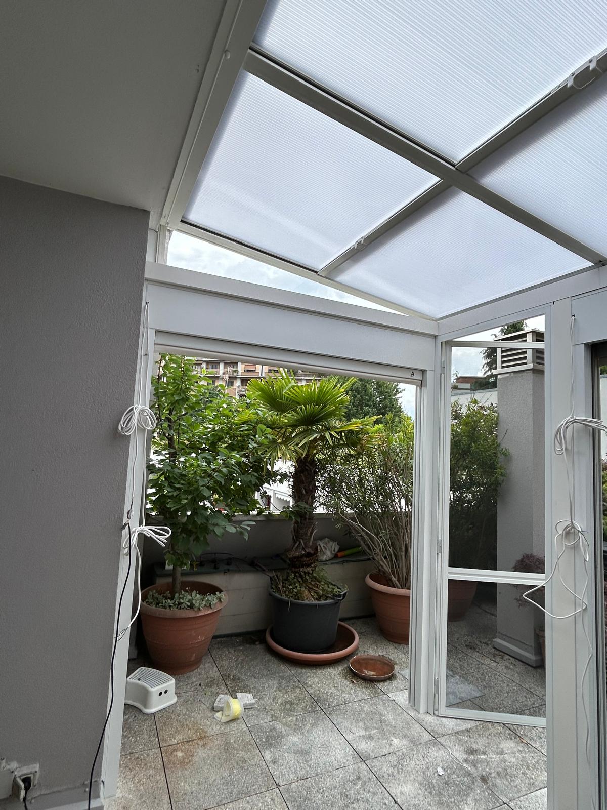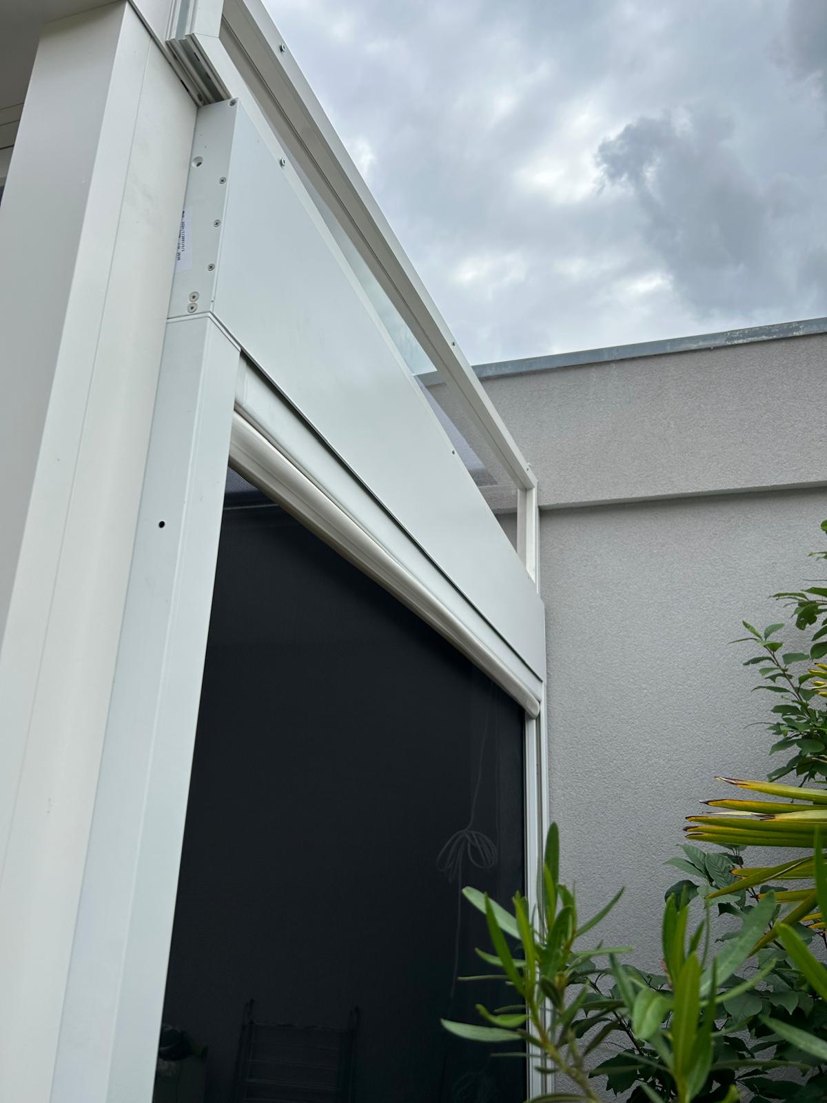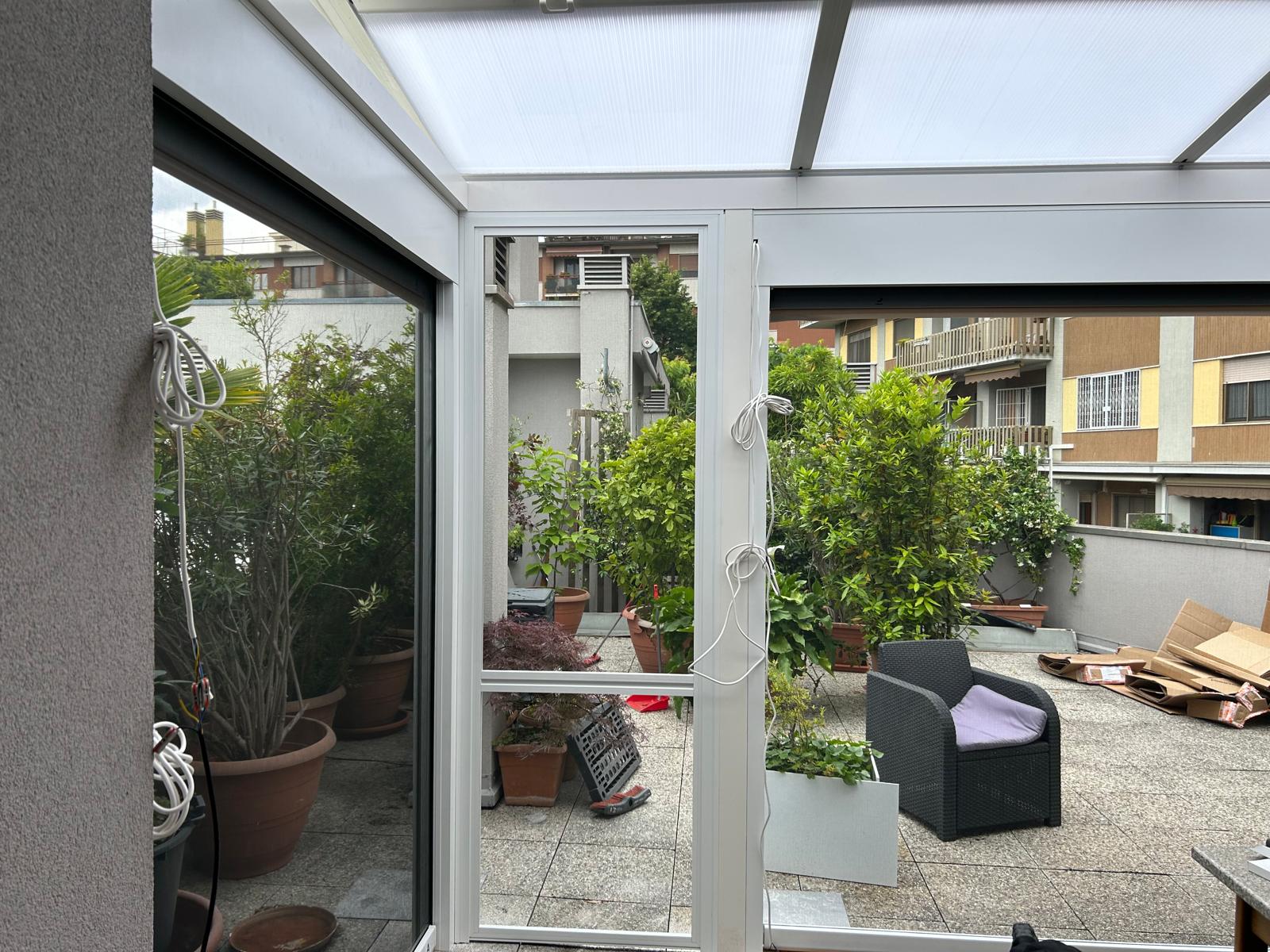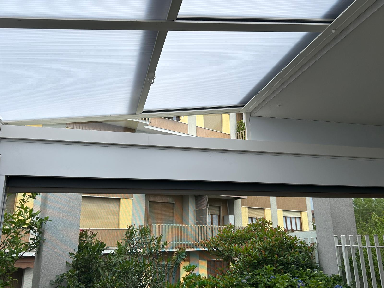 Realizzazione di pergola Nubes con policarbonato alveolare scorrevole e chiusure con doppi rulli, zanzariera Tuff screen e Crystal. Inserimento laterale di porta a battente per uscita.