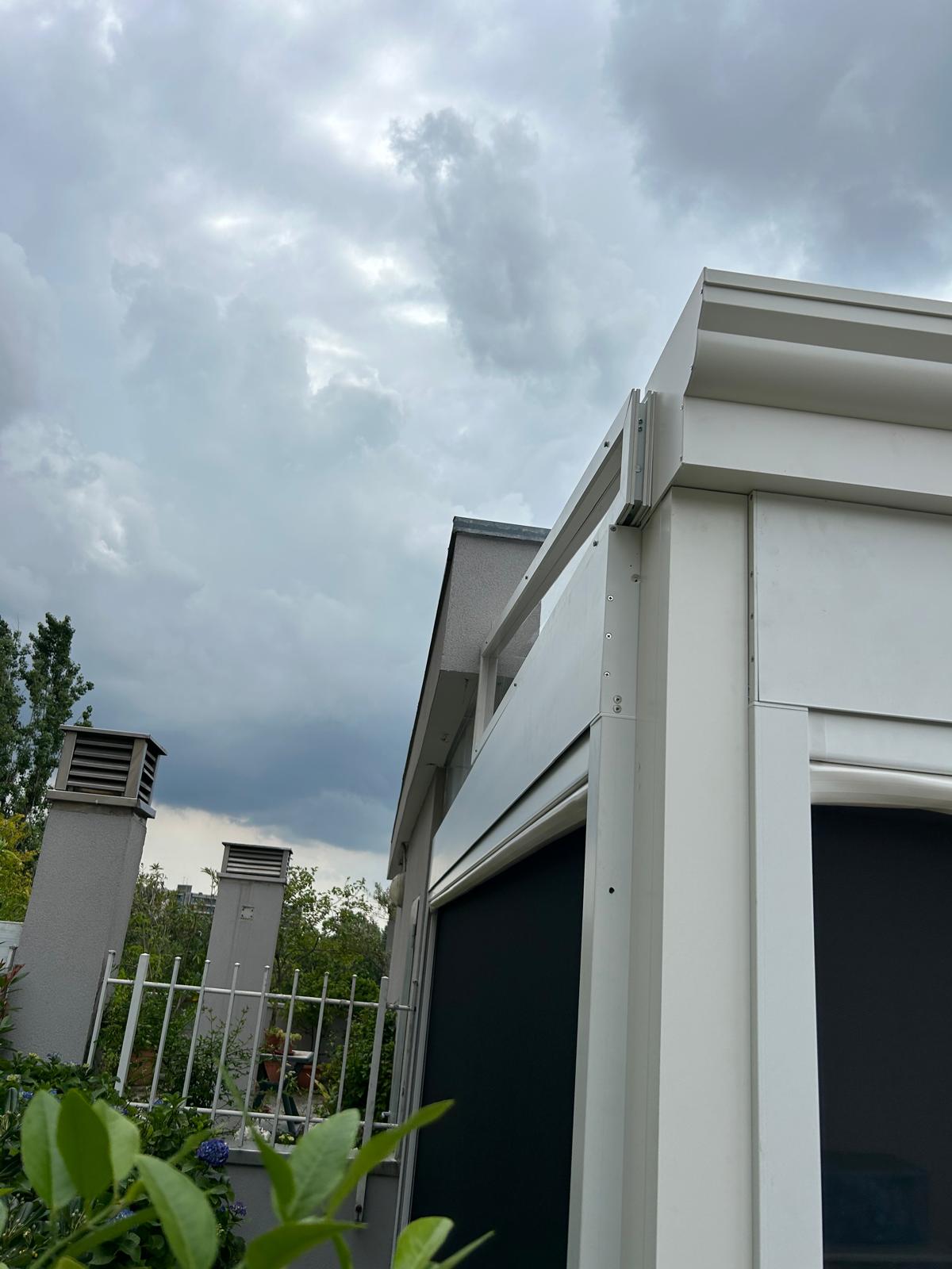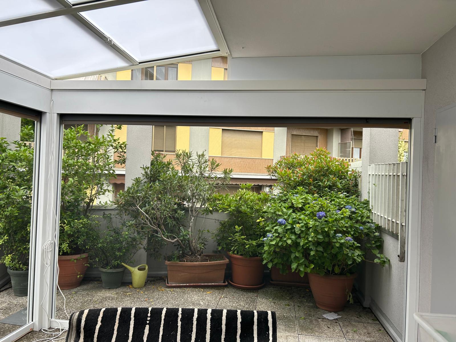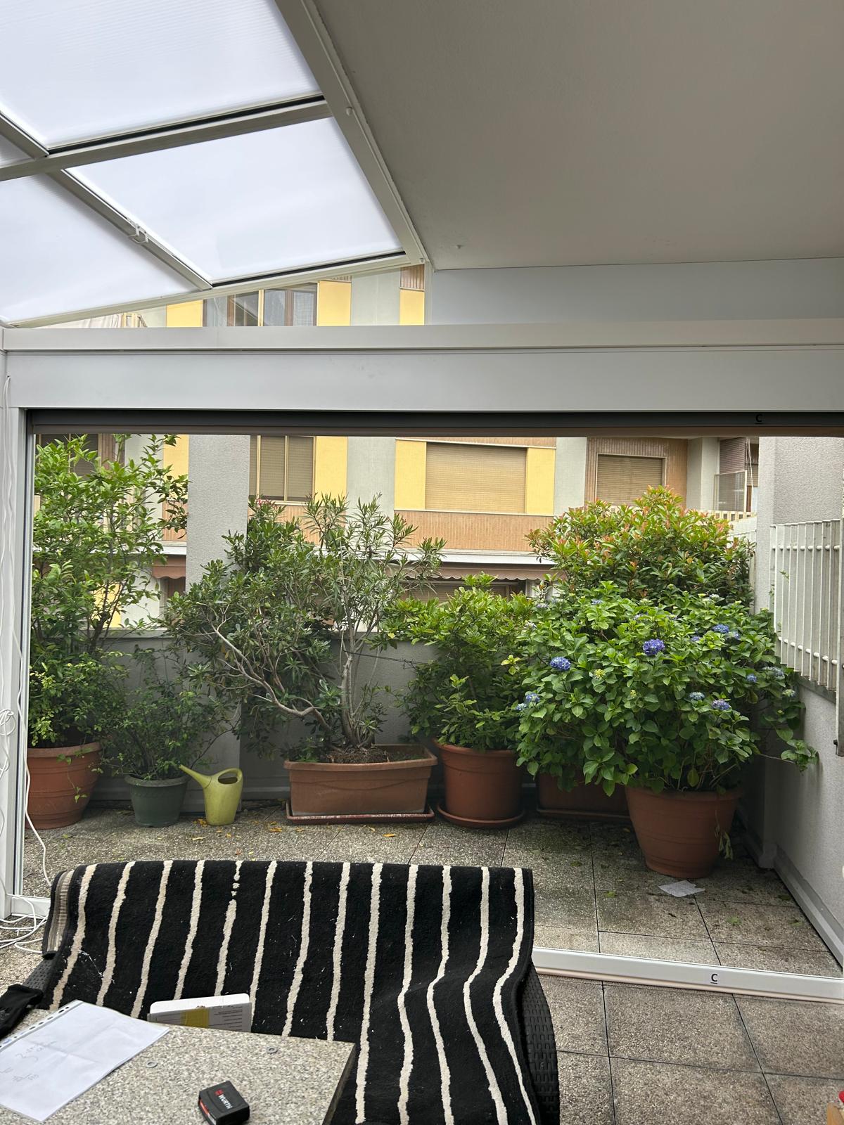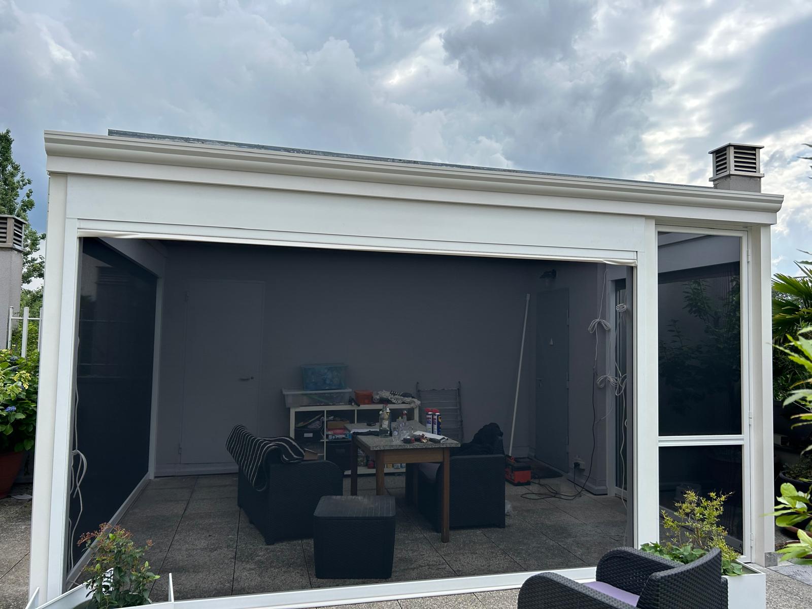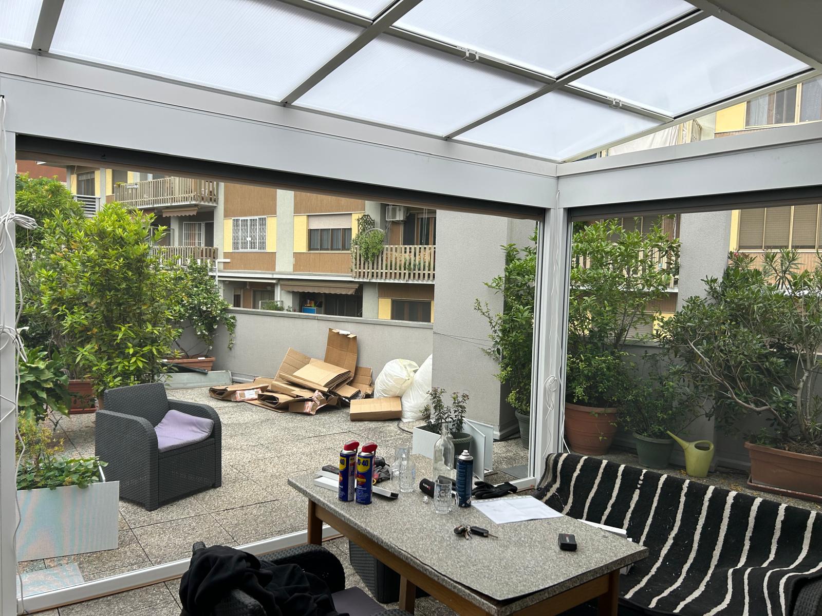 Realizzazione di pergola Nubes con policarbonato alveolare scorrevole e chiusure con doppi rulli, zanzariera Tuff screen e Crystal. Inserimento laterale di porta a battente per uscita.