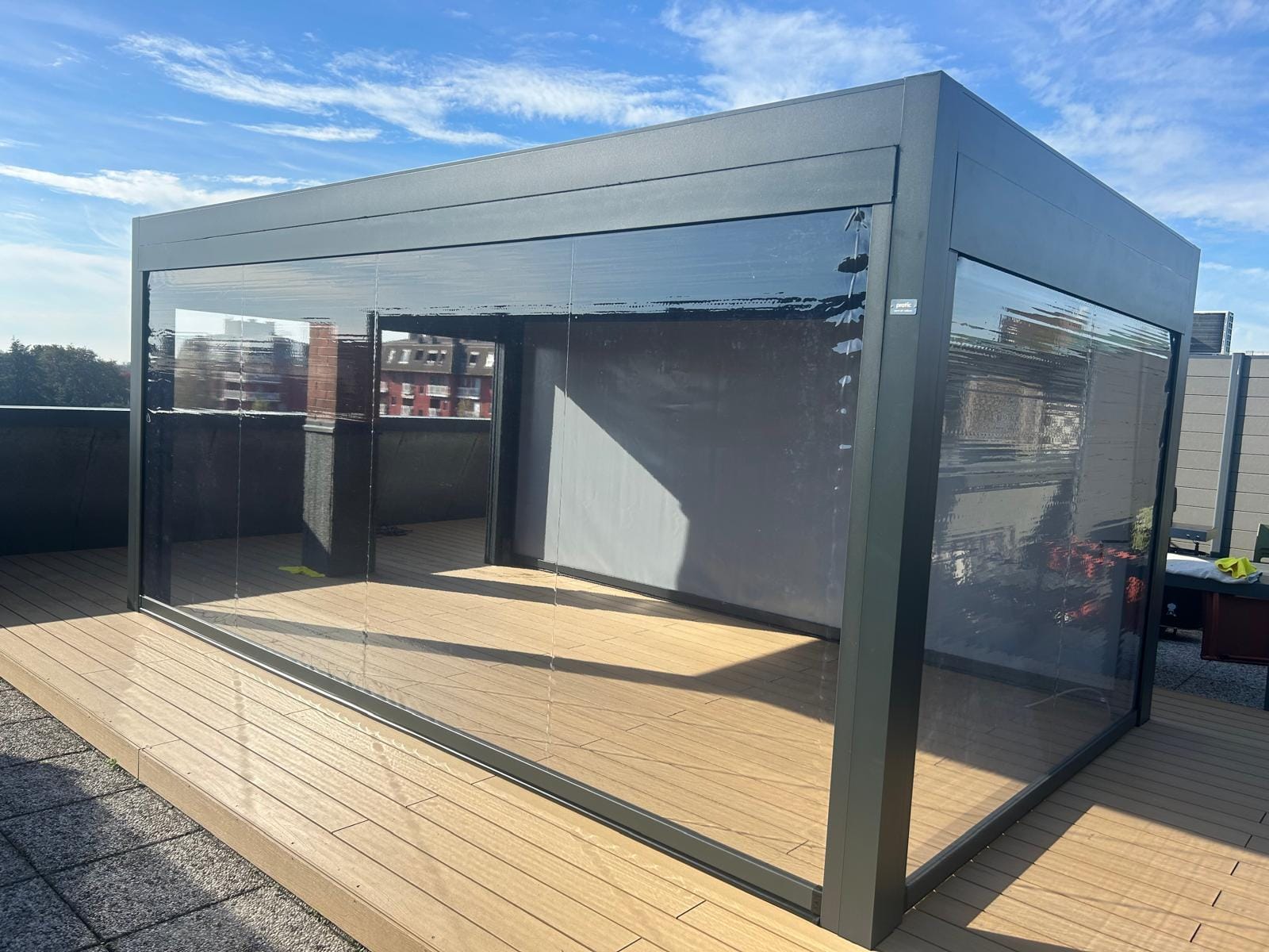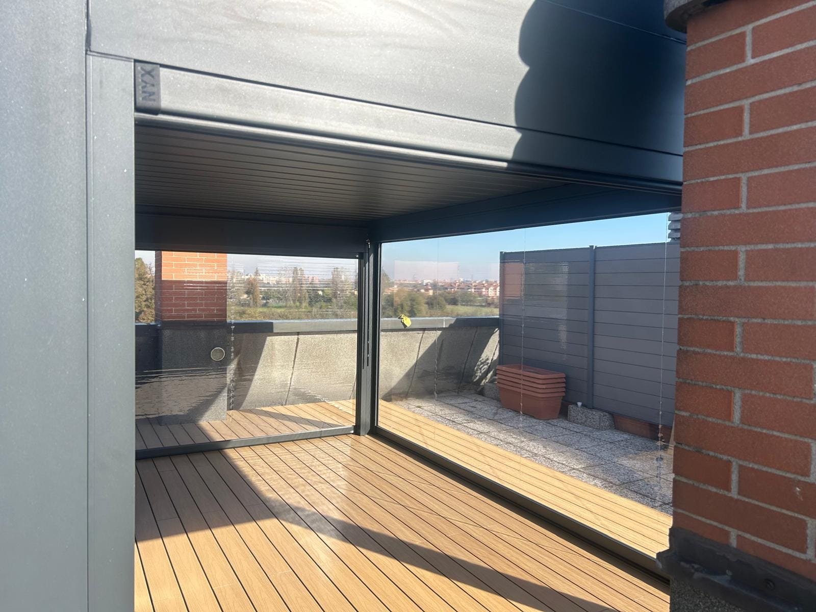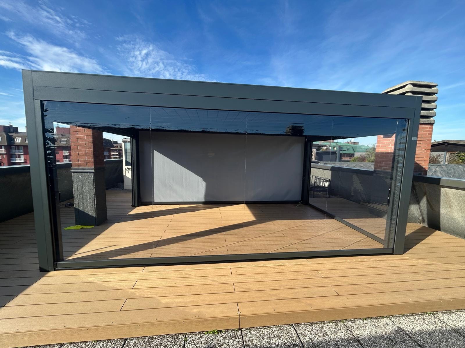 Installazione di Pergola Sense colore grigio ferro con chiusura sui 4 lati. Realizzata con doppi rulli zanzariera e Cristal, la parte posteriore è in pvc colorato per simulare la presenza di una parete.