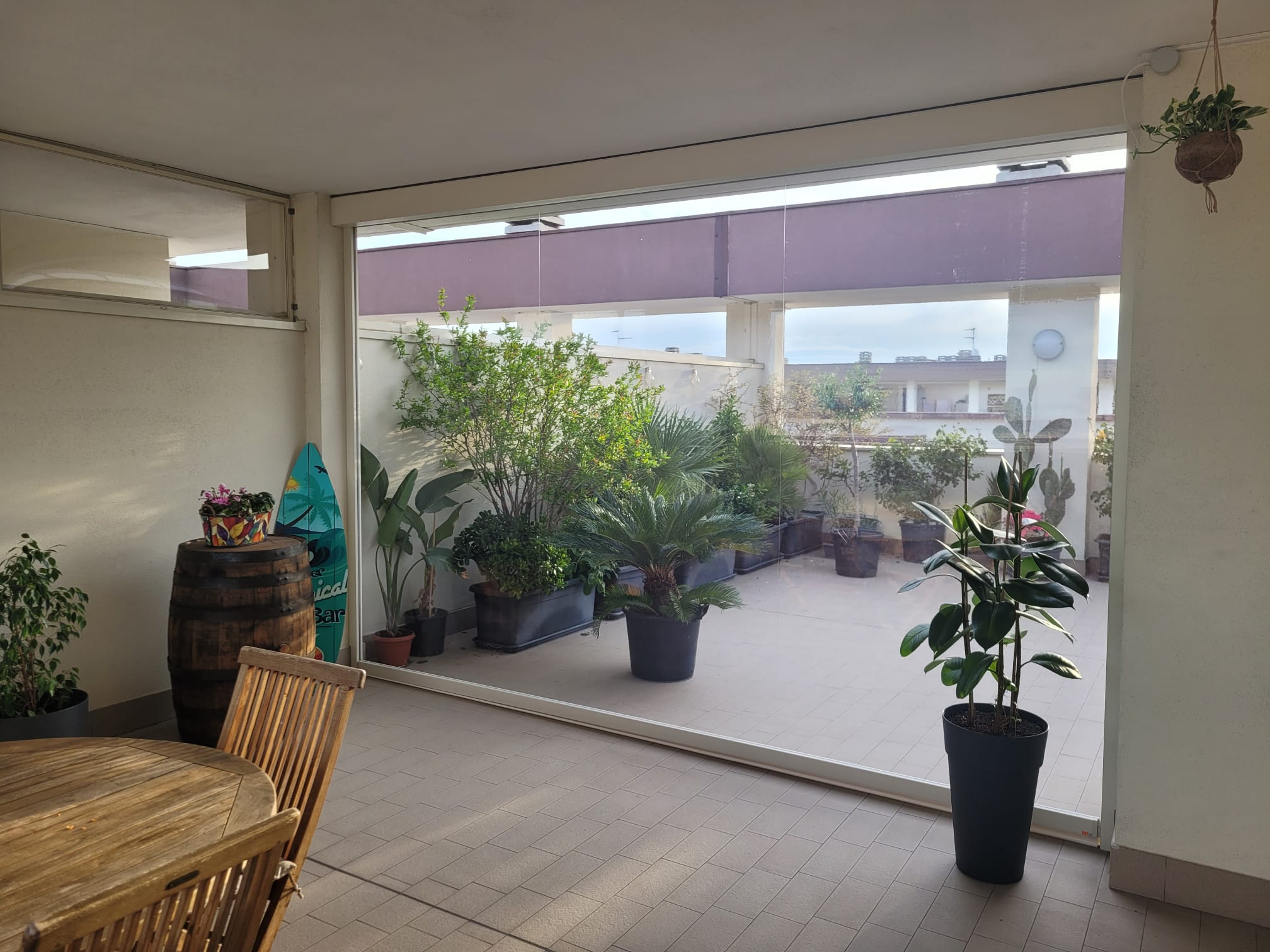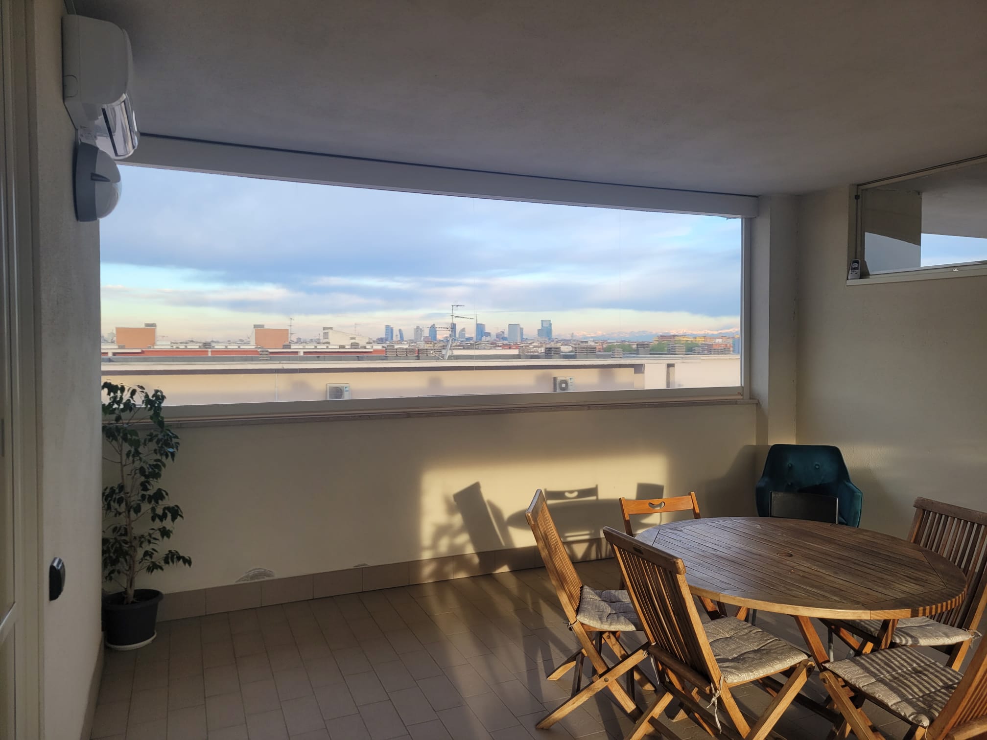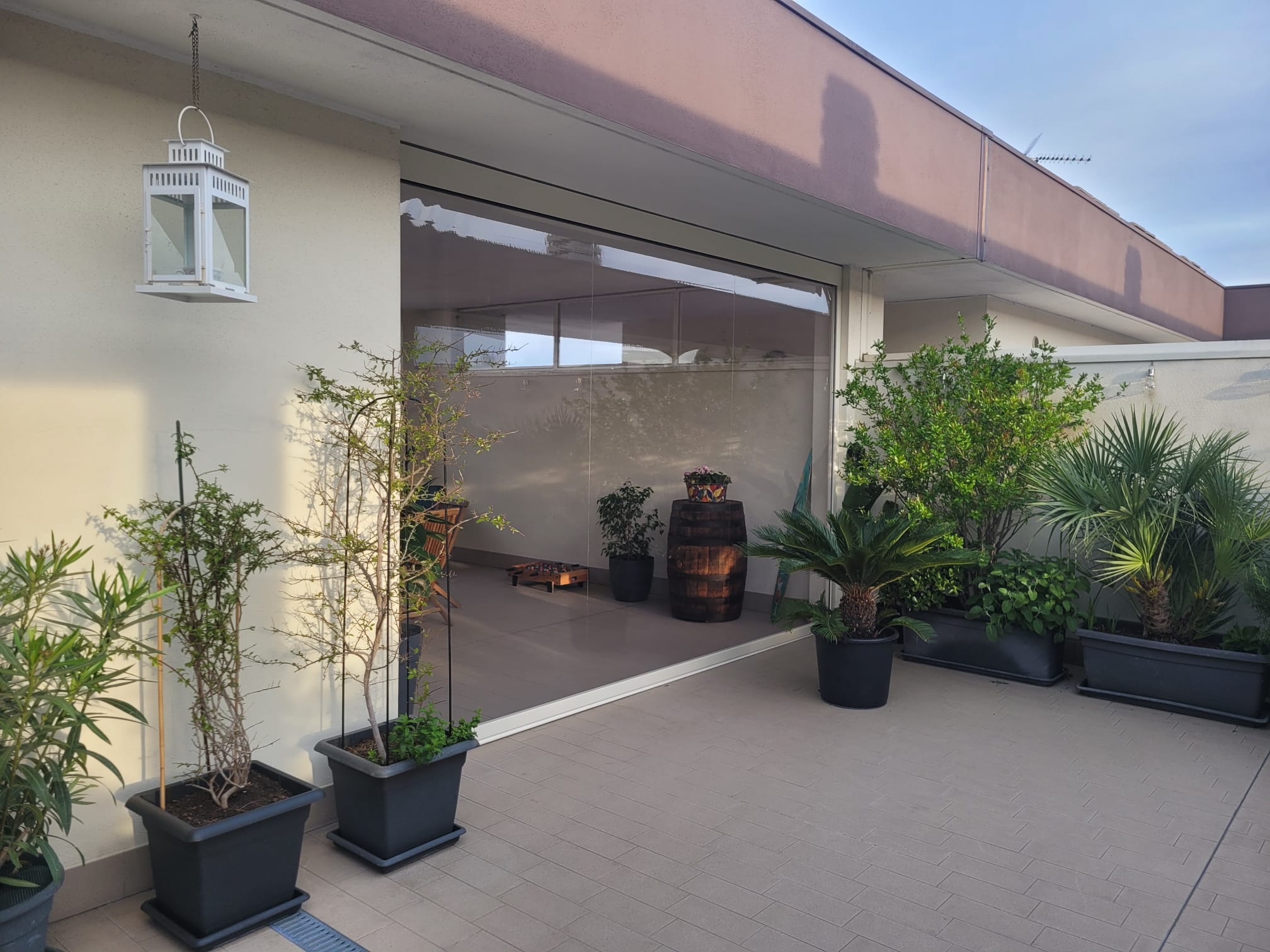Chiusura di spazio esterno con tende in Crystal Kzip e porta a libro modello Libra in policarbonato realizzati al settimo piano di una residenza a Milano.